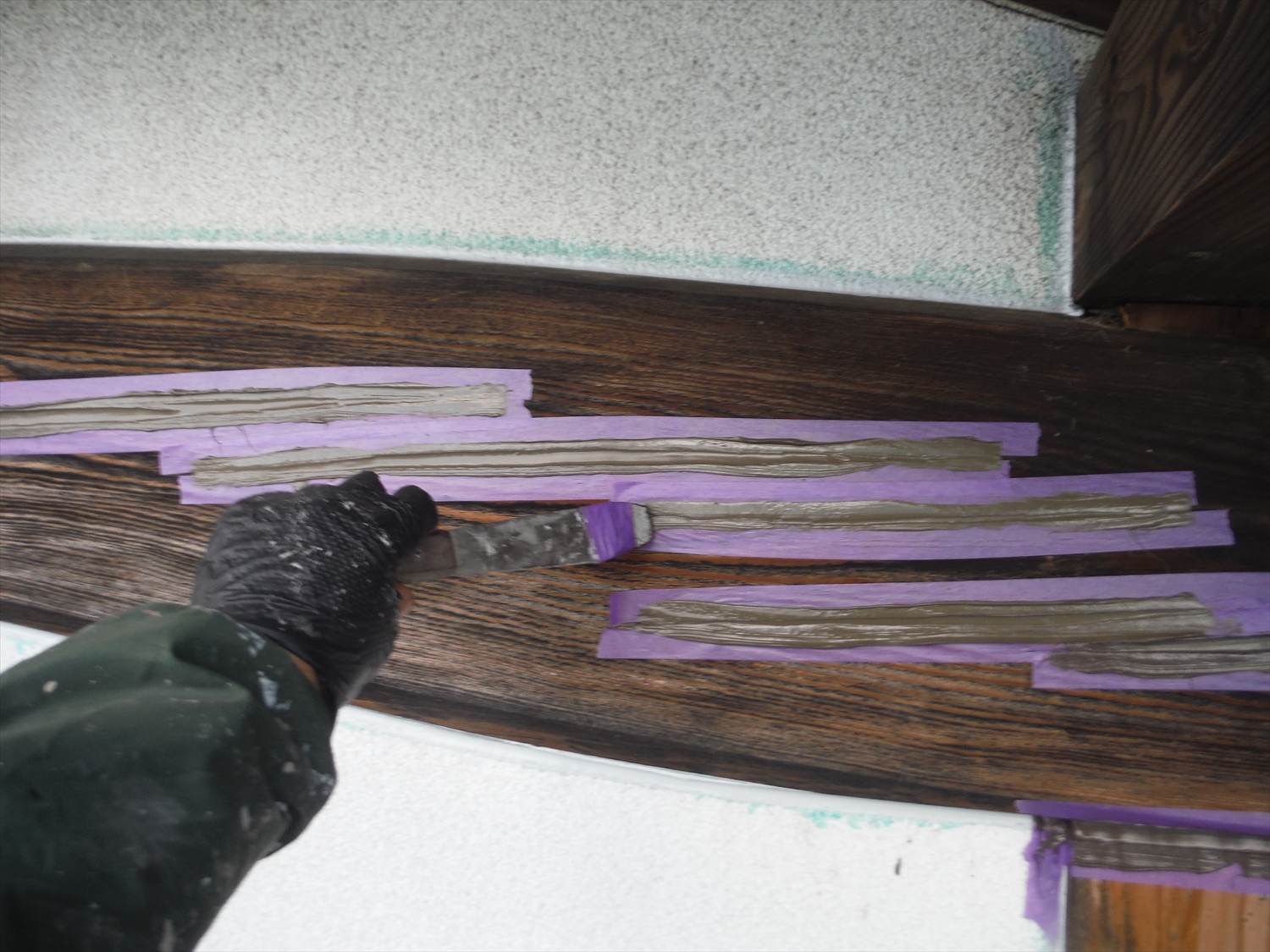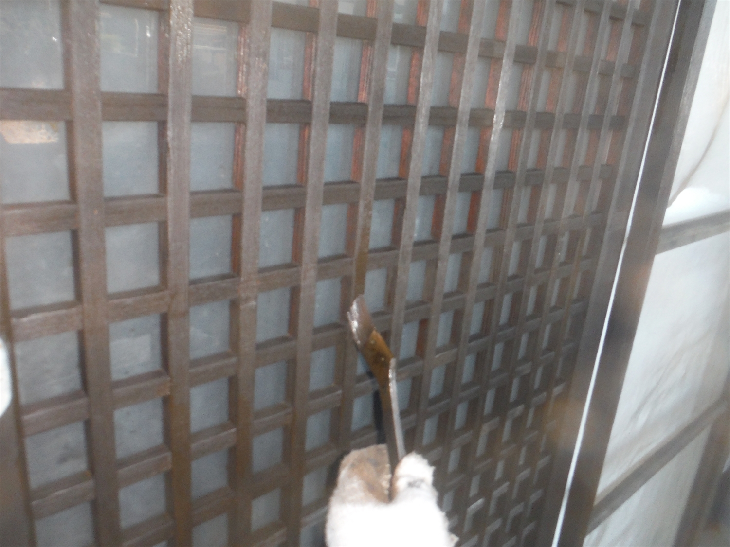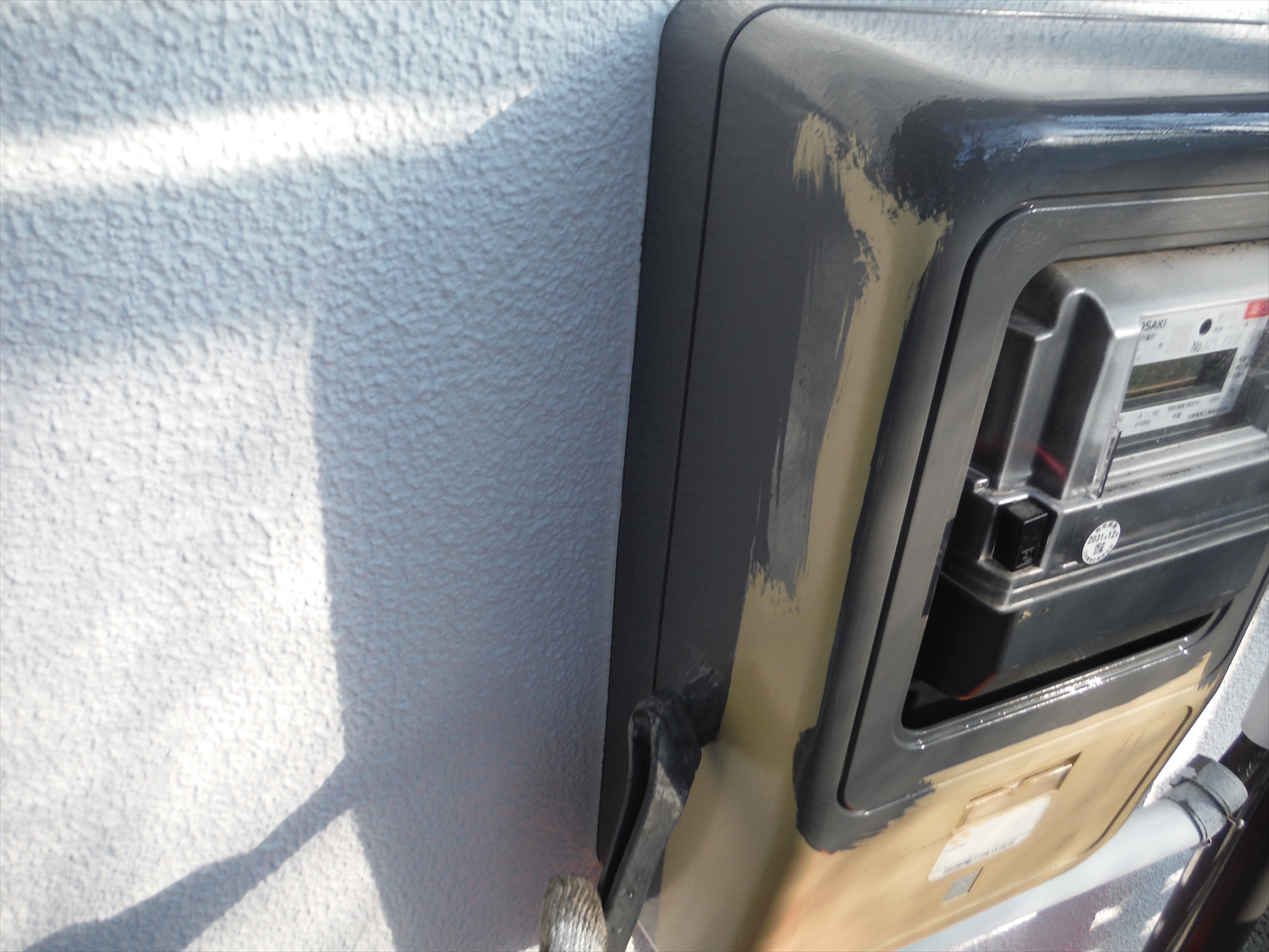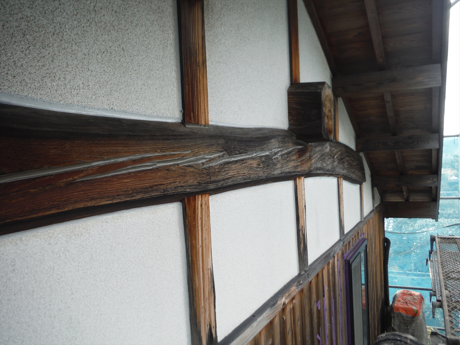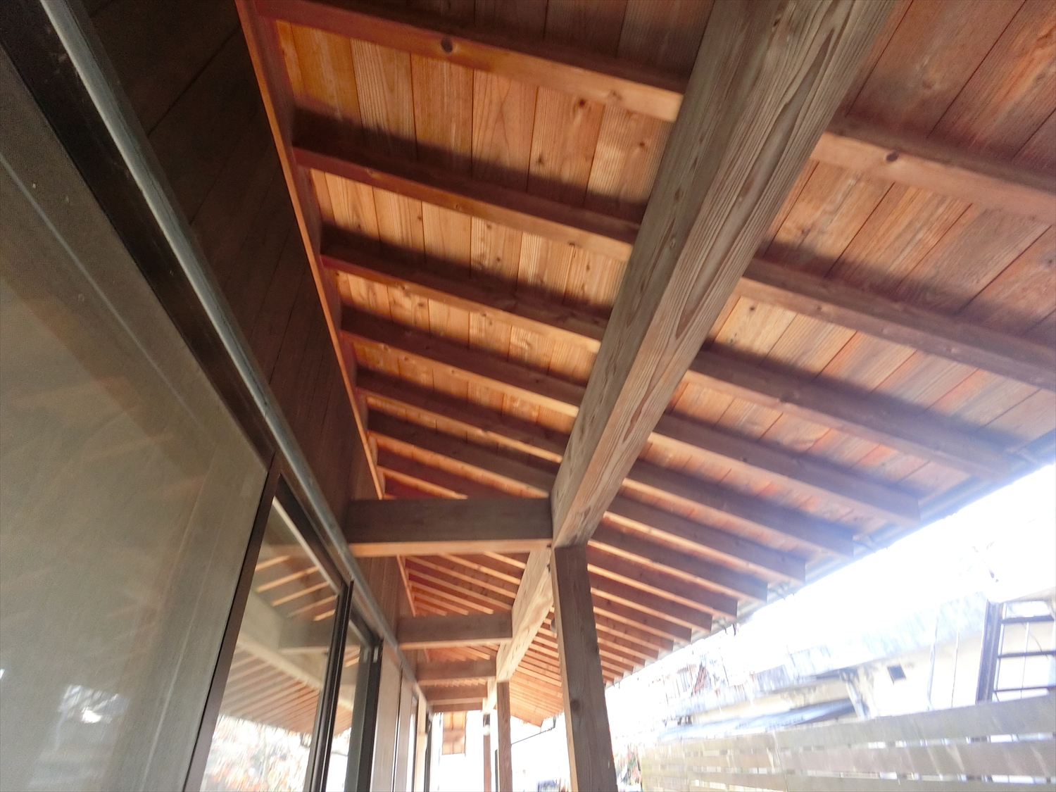 | その他の工事 | 軒天/洗浄、ケレン、ニューボンデンDX塗装(2回塗り) 雨樋/ケレン処理、フッ素樹脂塗装(2回塗り) 破風板/ケレン処理、ウェザープロテクト塗装(3回塗り) 矢切・格子/ケレン処理、ウェザープロテクト塗装(2回塗り) 南板塀/洗浄、ケレン、ニューボンデンDX塗装(2回塗り) 塀・柱/ケレン処理、ウェザープロテクト塗装(2回塗り) 小庇垂木/ケレン処理、ニューボンデンDX塗装(2回塗り) フード・分電盤/エポキシ下塗り、フッ素樹脂塗装(2回塗り) デッキ表面/ケレン処理、ニューボンデンDX塗装 土台水切/エポキシ下塗り、フッ素樹脂塗装(2回塗り) 小庇板金/エポキシ下塗り、フッ素樹脂塗装(2回塗り) スリムダクト/プライマー処理、フッ素樹脂塗装(2回塗り)ほか |